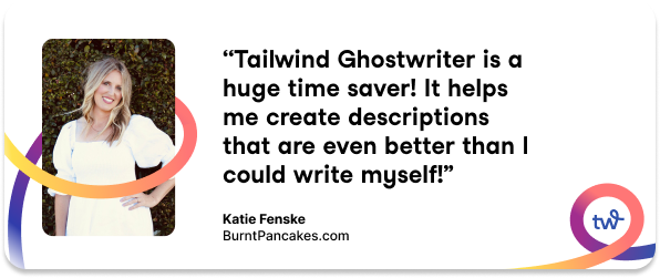 💥 Spend Less Time on Routine Tasks - Thinking of what to post, writing captions, resizing images for different platforms - bleh! Tailwind snips all that time in half with tools like Copilot for post inspiration and plans, Ghostwriter for captions, descriptions and email subject lines, and Create for done-for-you images for your favorite platforms.